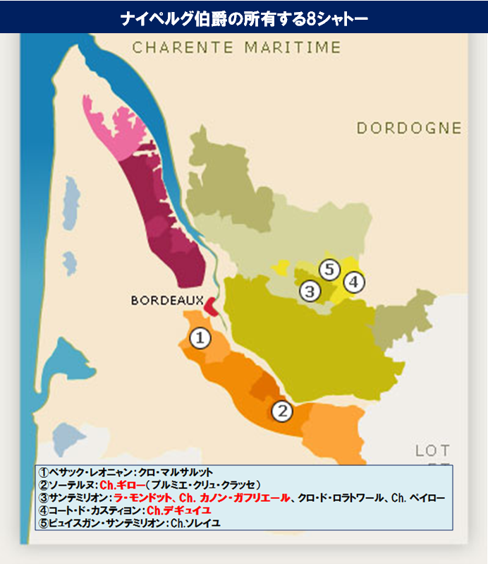 ラ・モンドット、クロ・ド・ロラトワール、シャトー・カノン・ラ・ガフリエールなど数々の名シャトーを所有するナイペルグ伯爵が、いまボルドーで最も刺激的なワイン産地と言われるコート・ド・カスティヨンで新たな挑戦をするワイン。3000円以下のメルロ主体ボルドーとして、まさにトップ・オブ・トップクオリティの1本がここに。